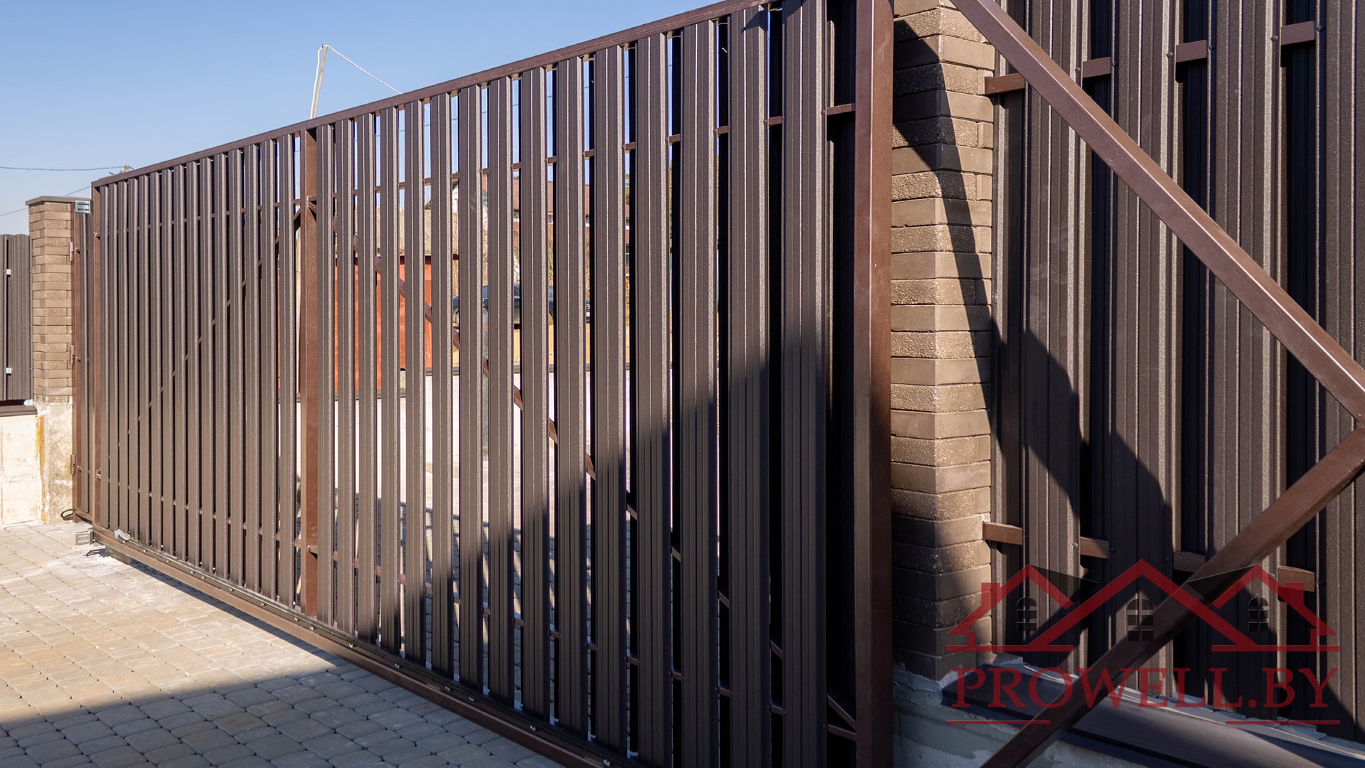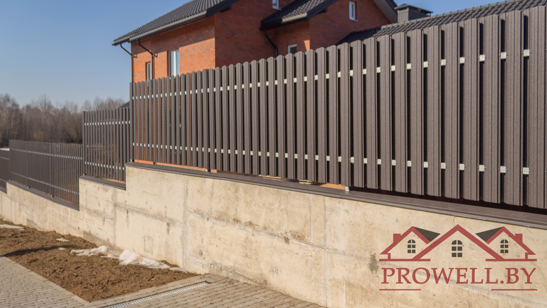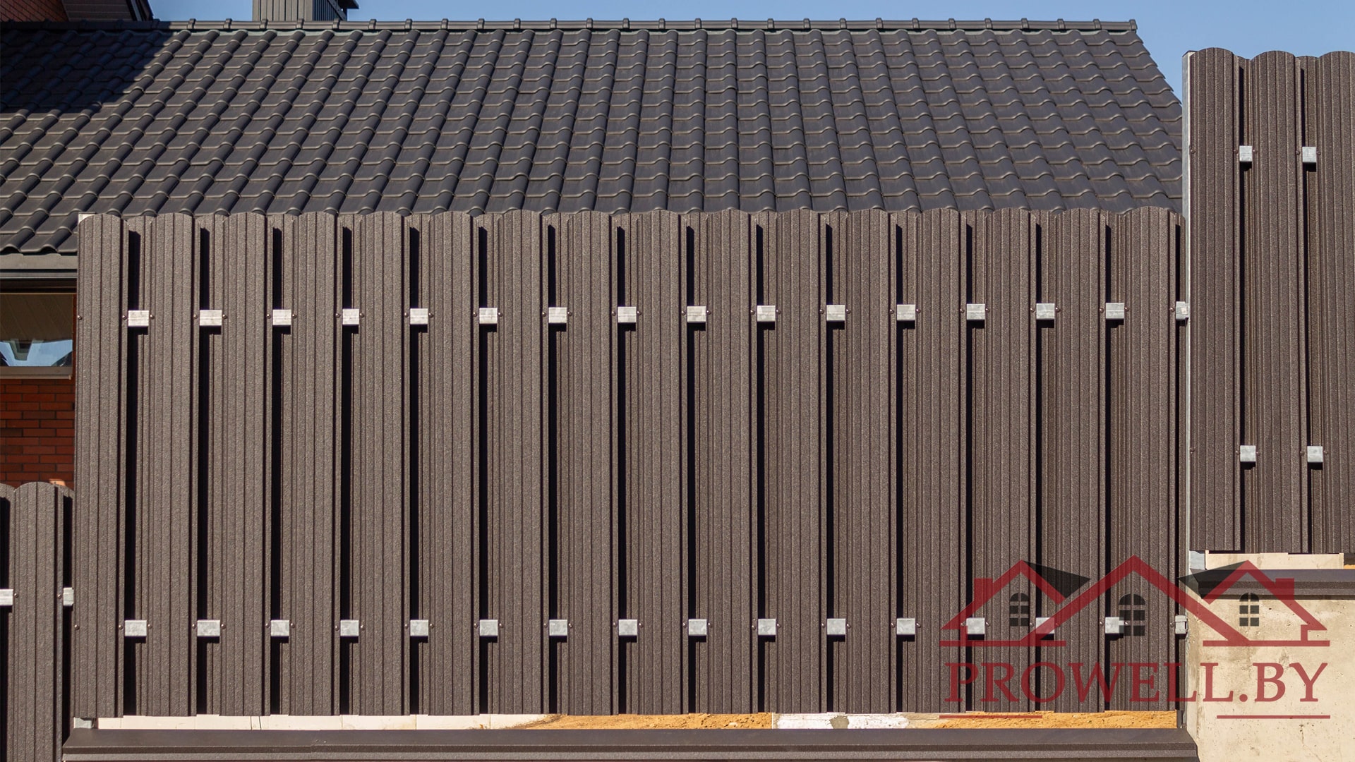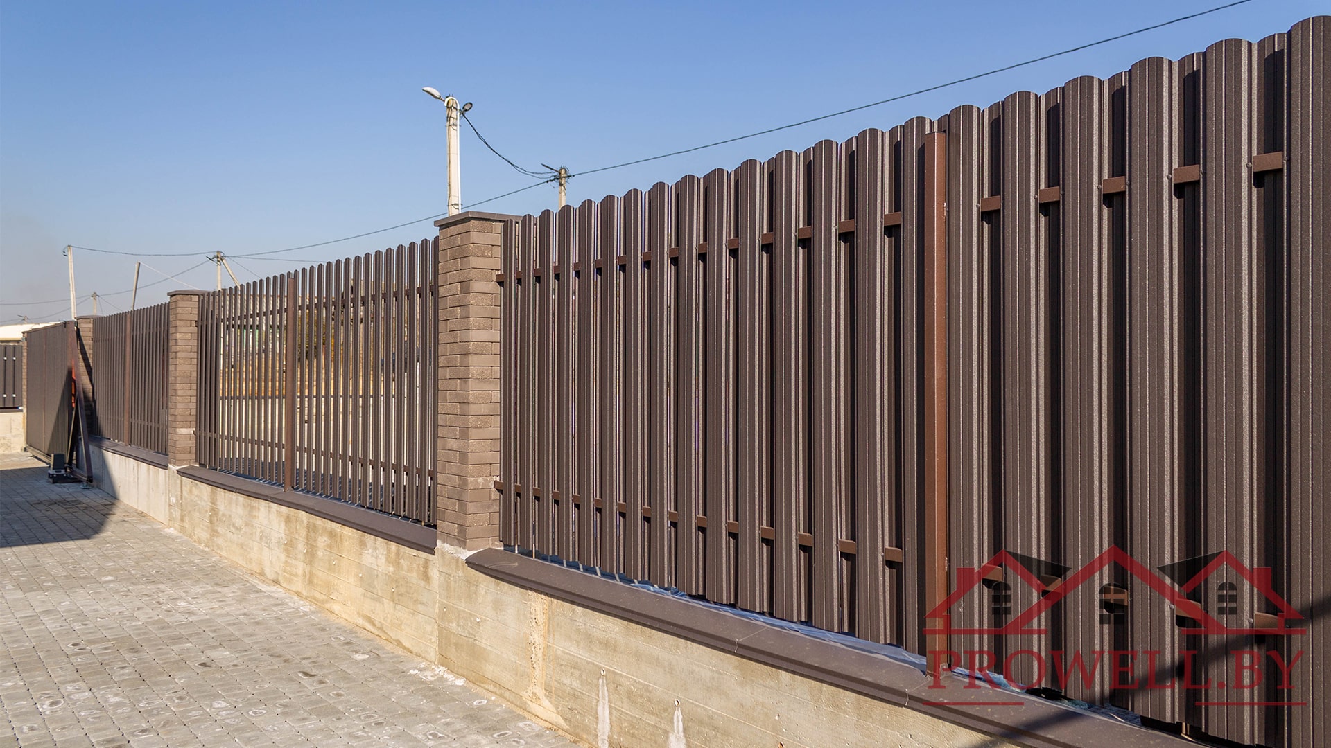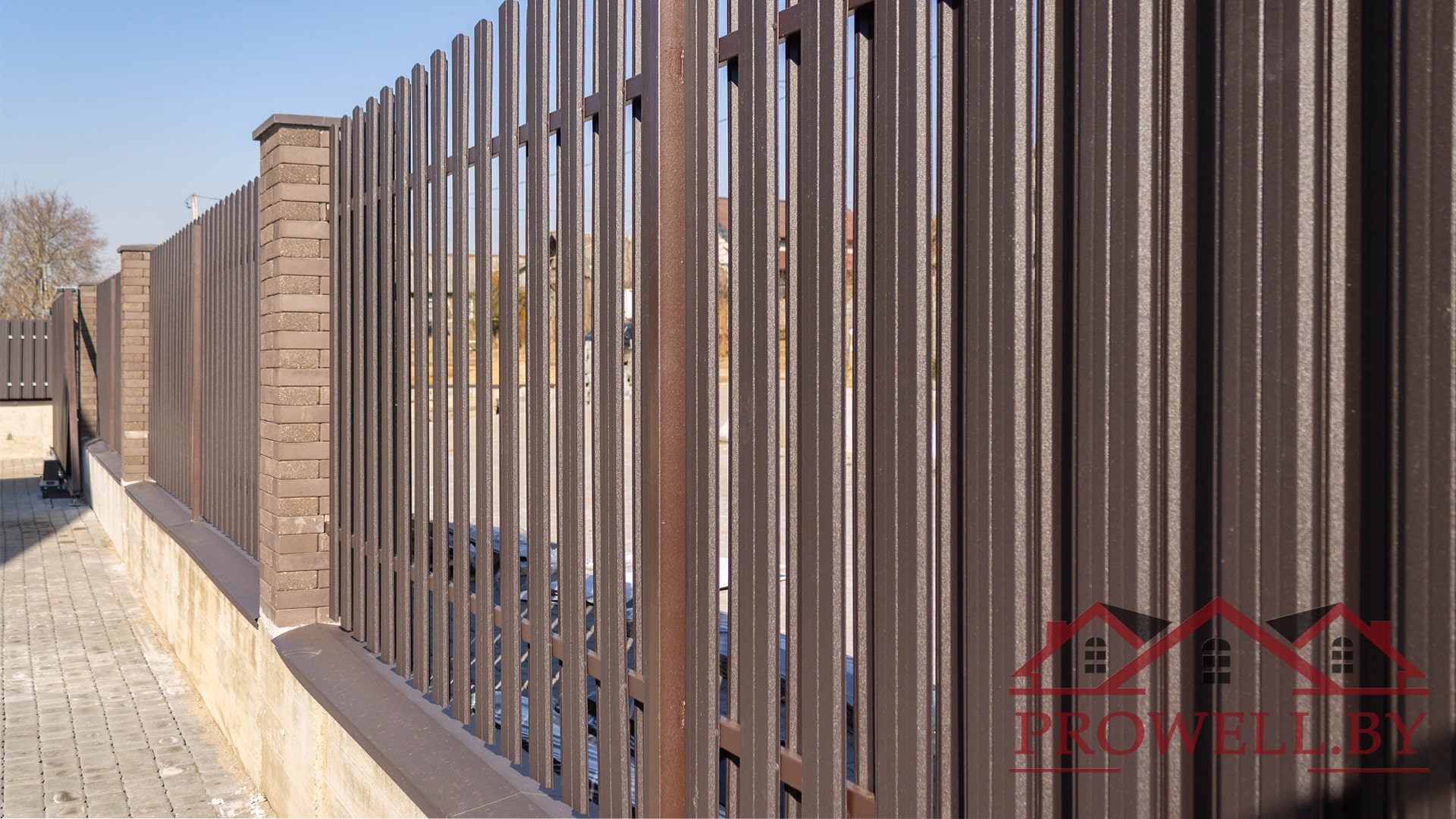 Забор из ЛЕГО КИРПИЧА, металлического штакетника "КЛАССИК (114 мм)" RAl 8019 (темно-коричневый) MAT + ворота откатные + калитка