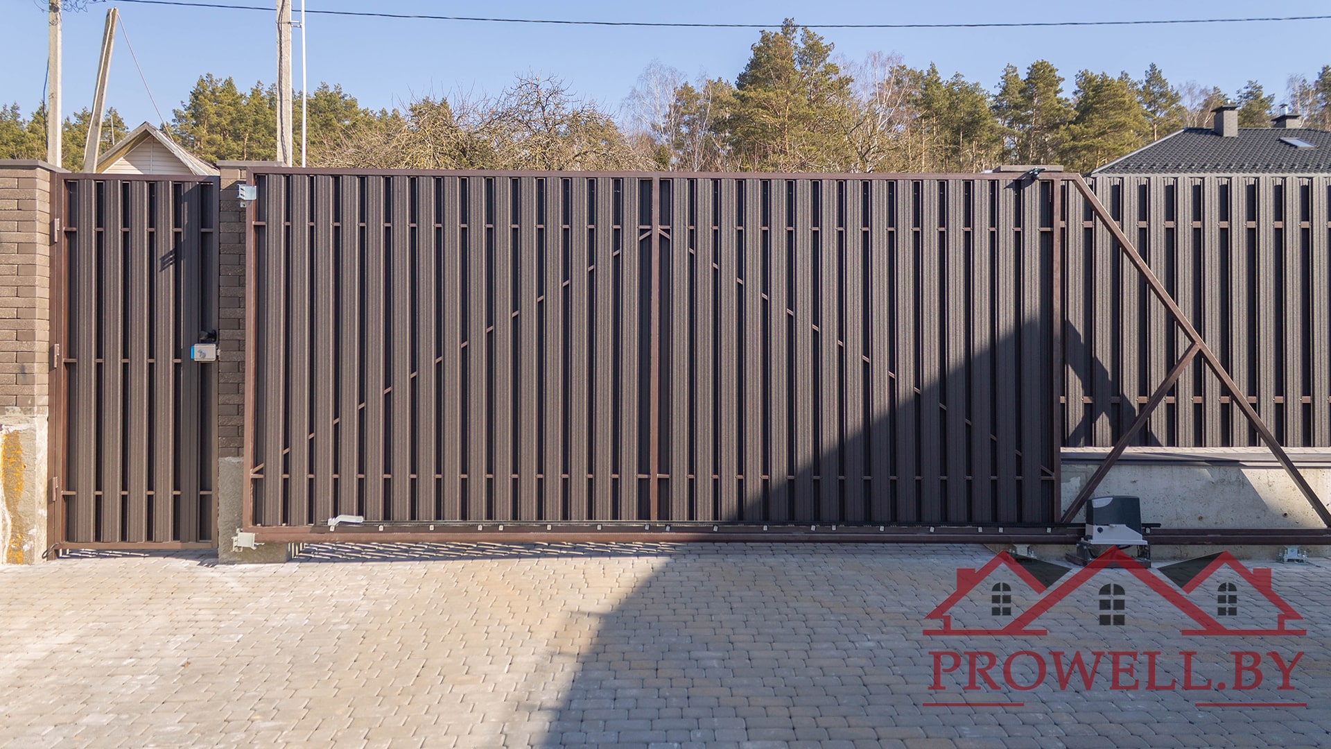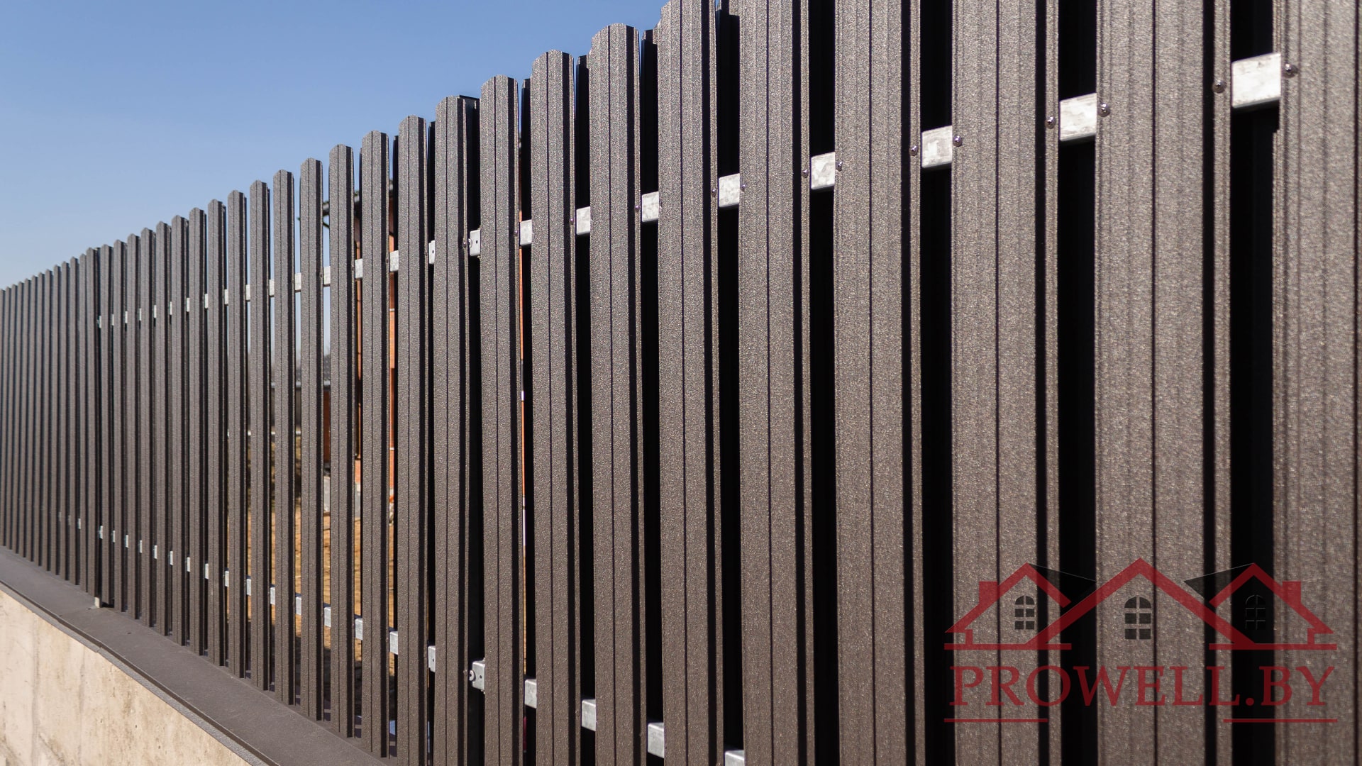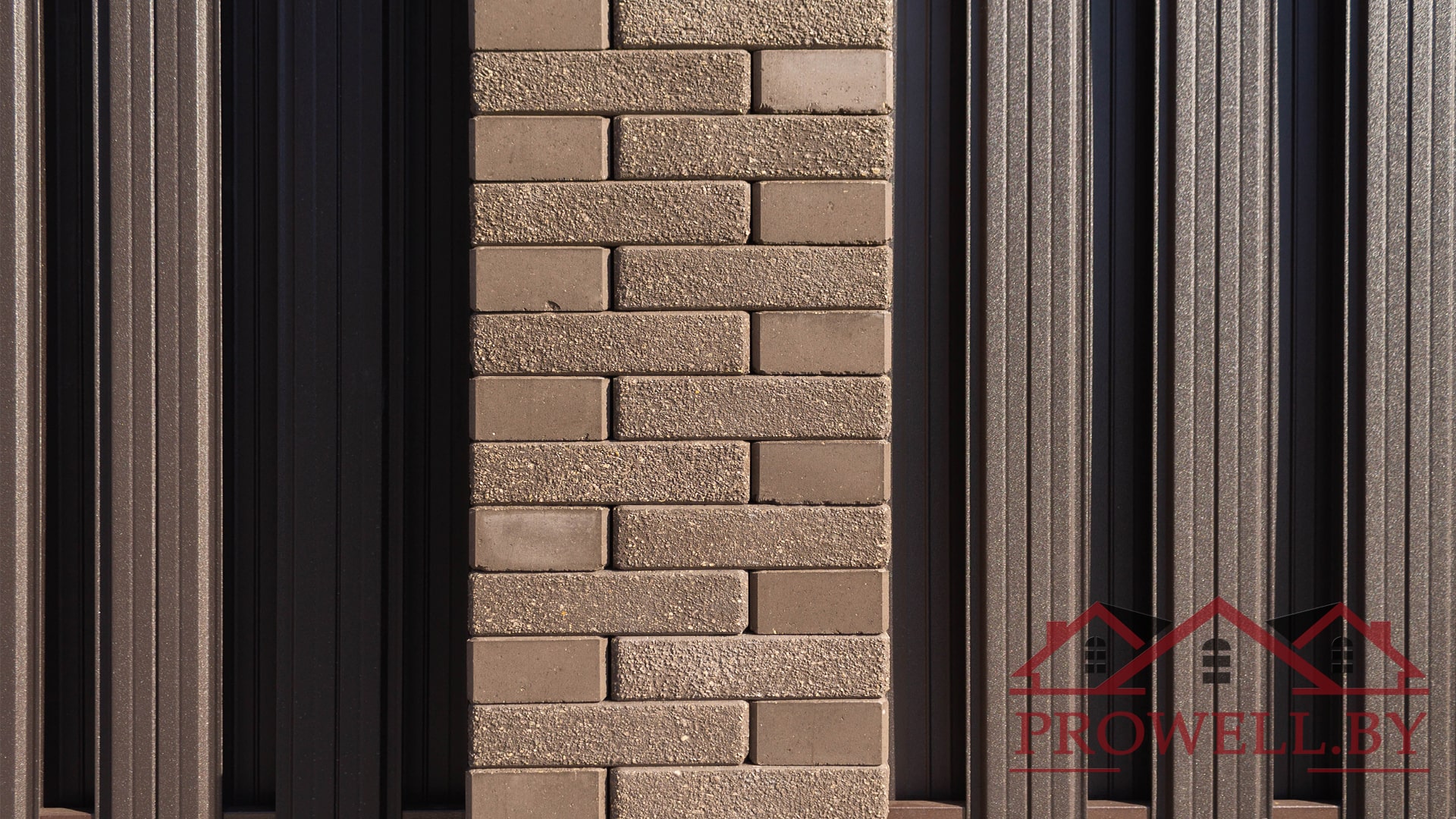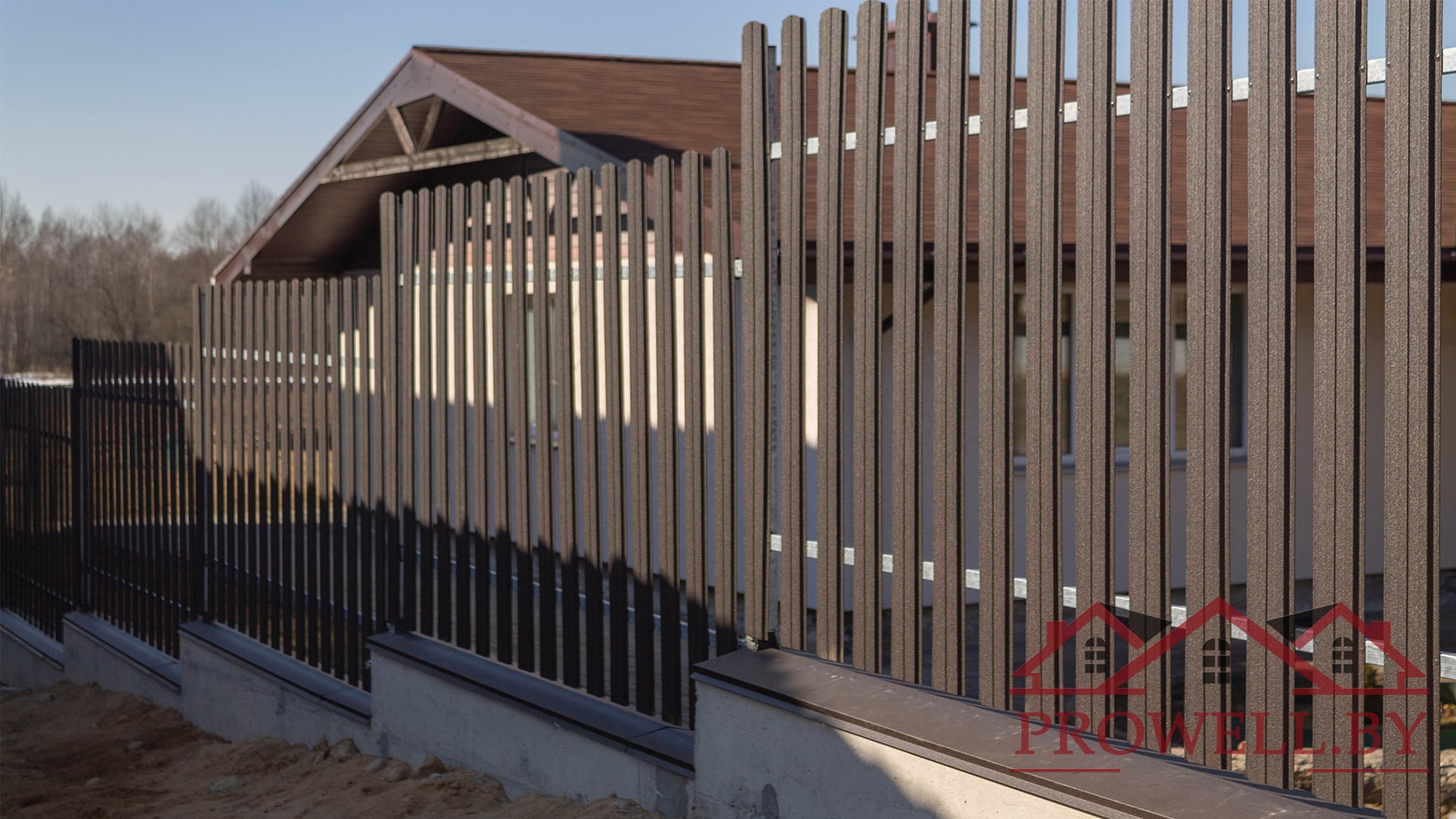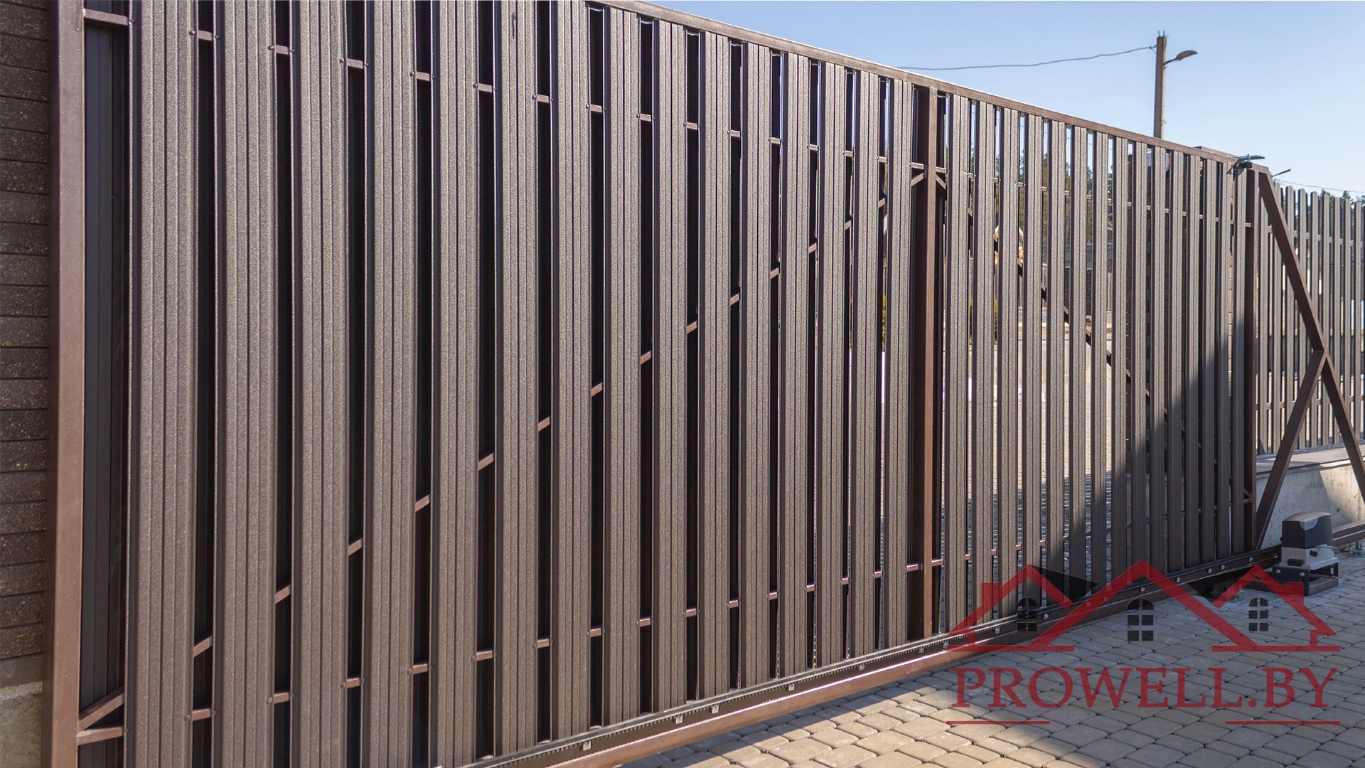 Забор из ЛЕГО КИРПИЧА, металлического штакетника "КЛАССИК (114 мм)" RAl 8019 (темно-коричневый) MAT + ворота откатные + калитка