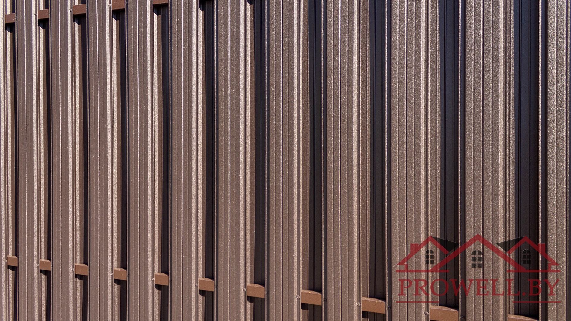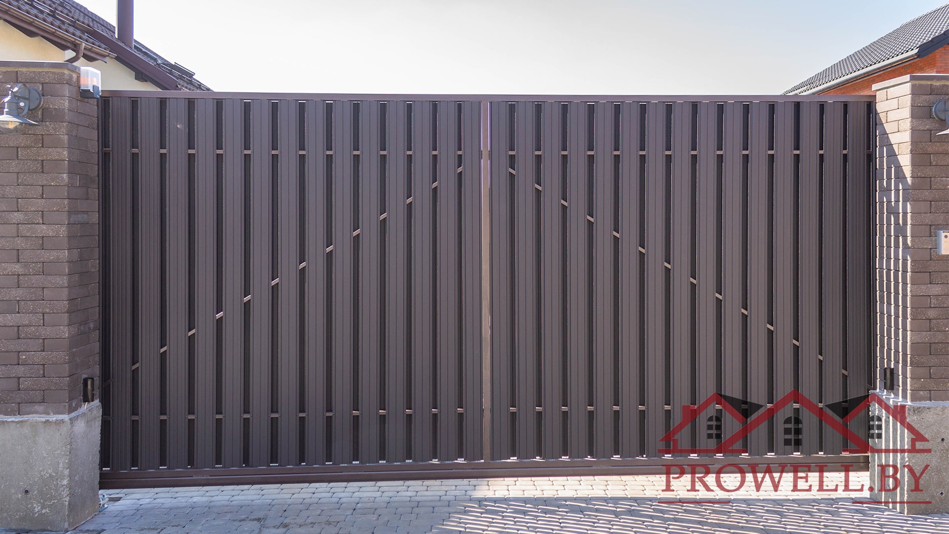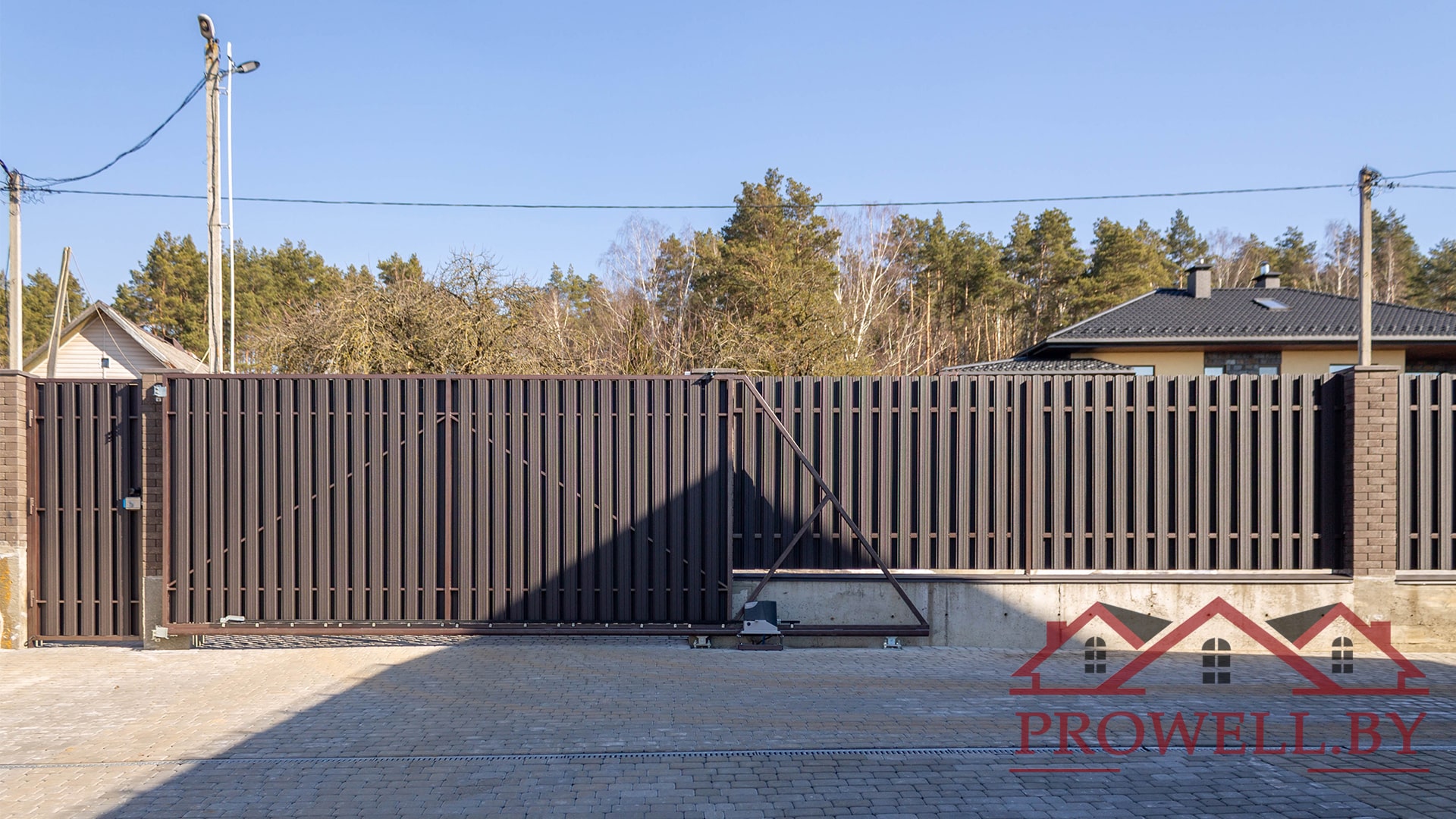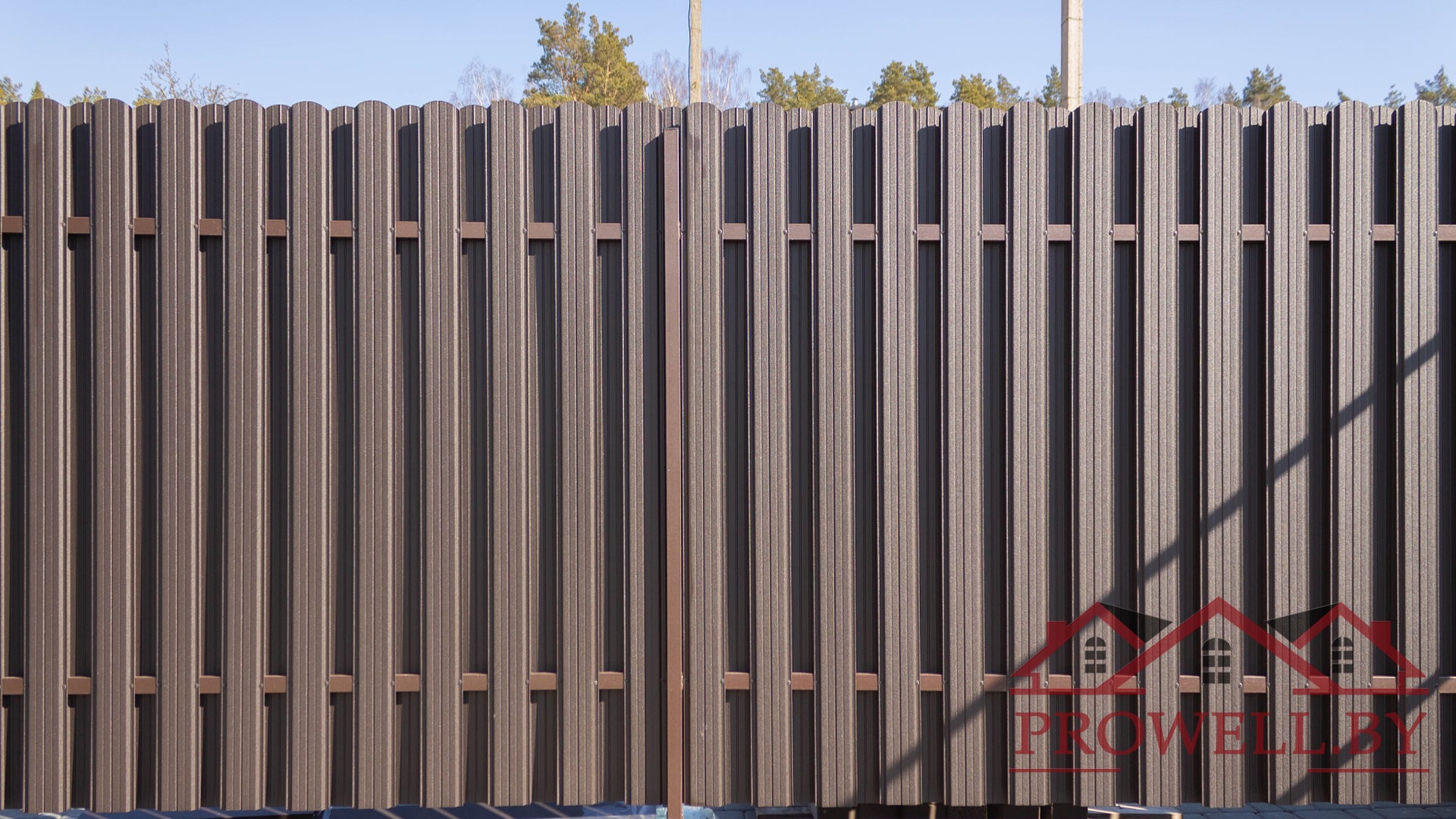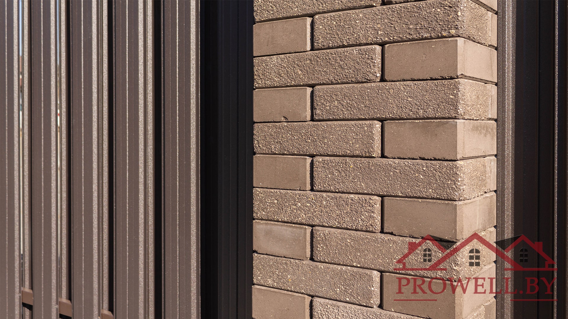Забор из ЛЕГО КИРПИЧА, металлического штакетника "КЛАССИК (114 мм)" RAl 8019 (темно-коричневый) MAT + ворота откатные + калитка