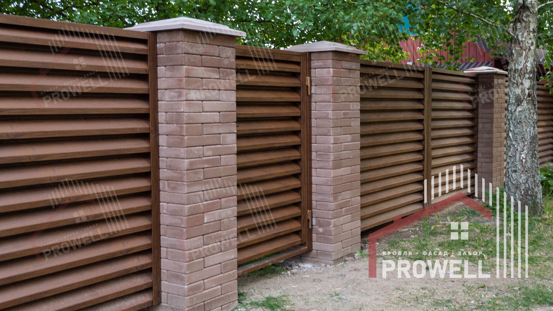 Используемые материалы: Заборы-жалюзи Классик (Classic), Калитка СТАЛЬНАЯ, Ворота распашные СТАЛЬНЫЕ, Кирпич ЛЕГО
