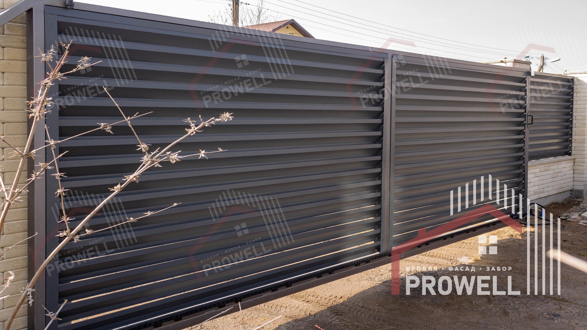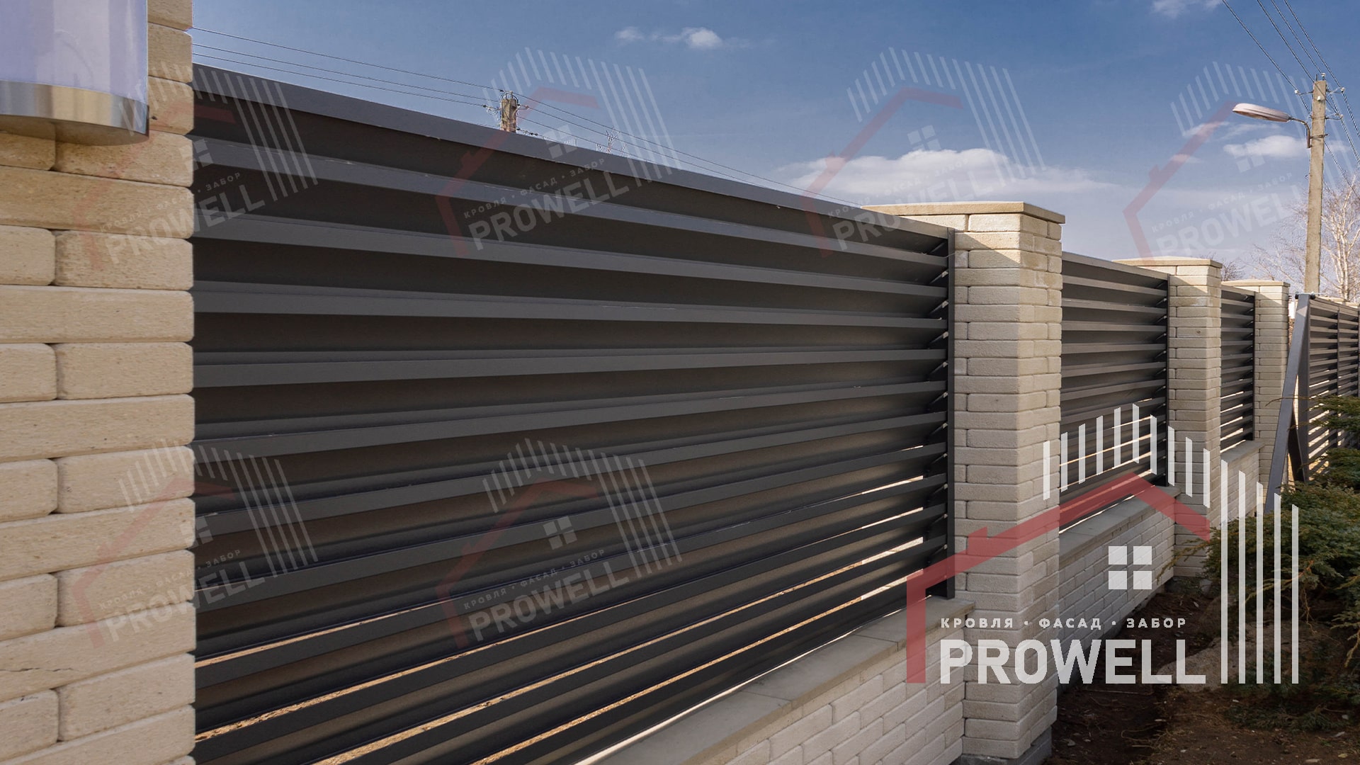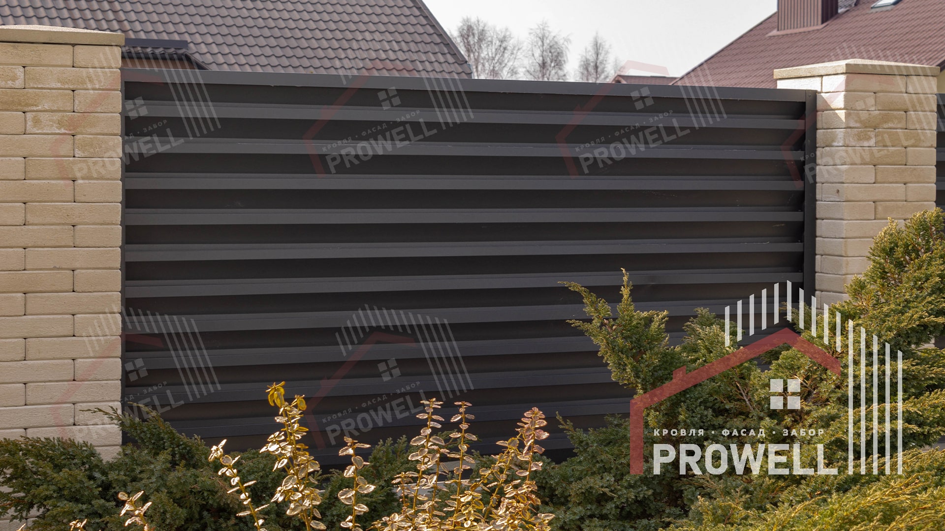 Ограждение реализовали в классическом цвете - RAL-7024 (серый графит). При производстве ламелей Жалюзи использовали высококачественную оцинкованную сталь и полимерное покрытие с хорошей адгезией и стойкостью к влаге, чтобы ограждение сохраняло свой цвет и технические характеристики в течение многих лет.