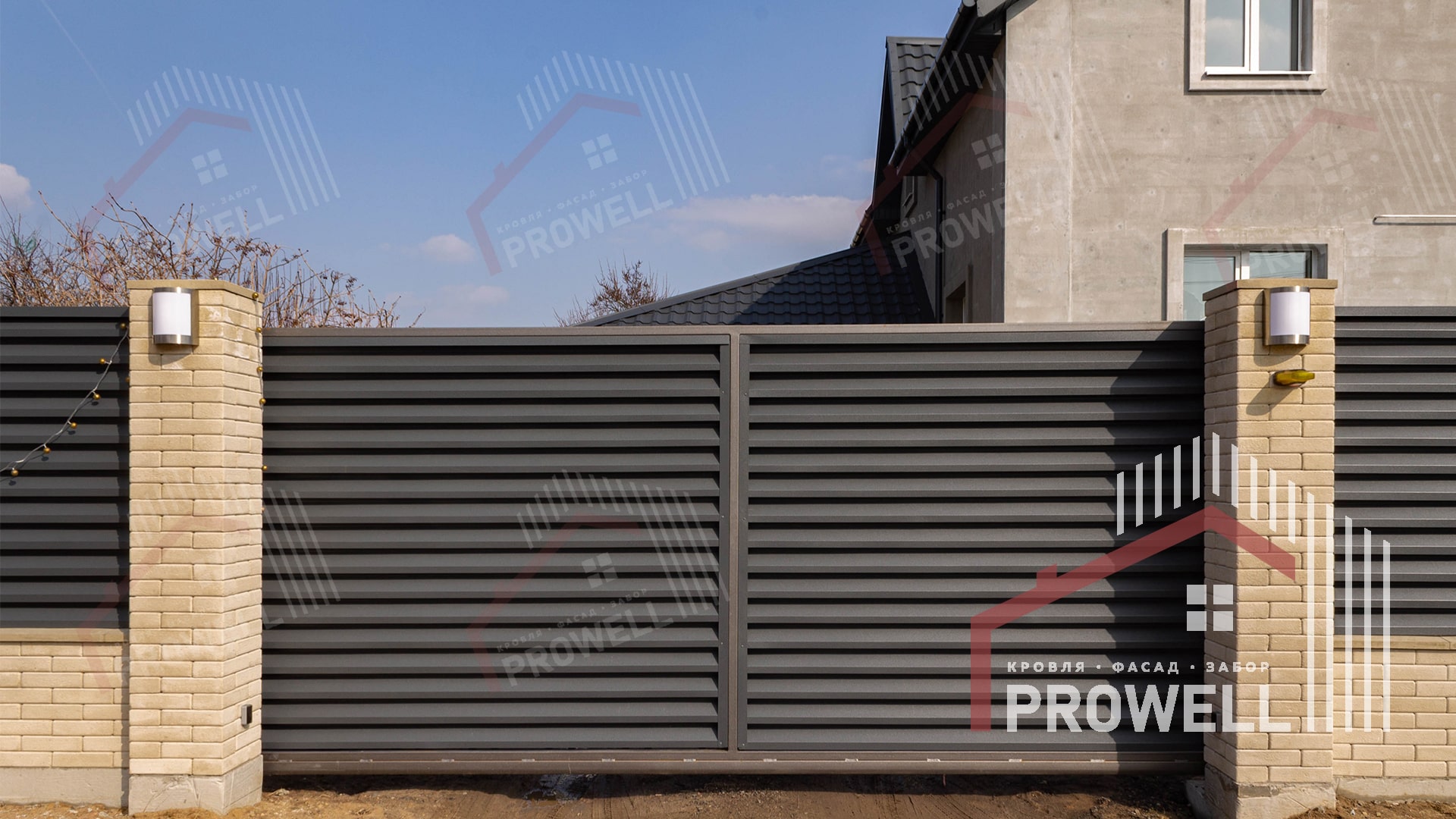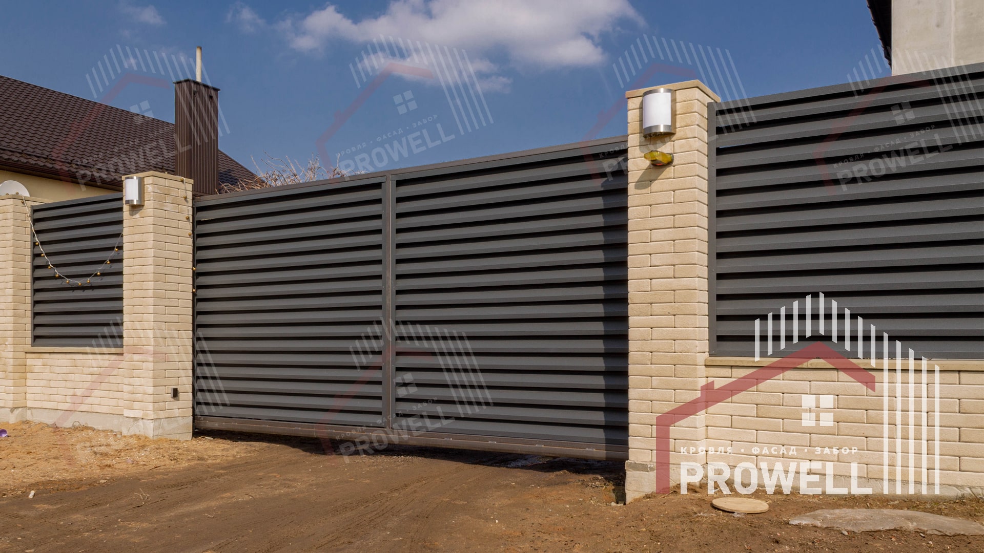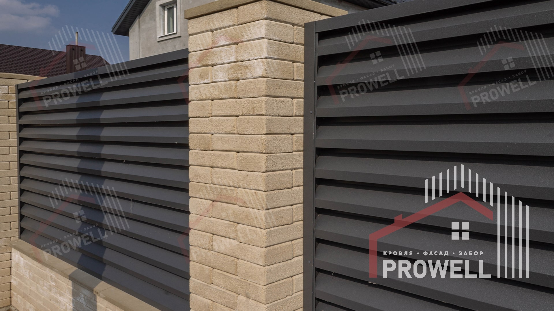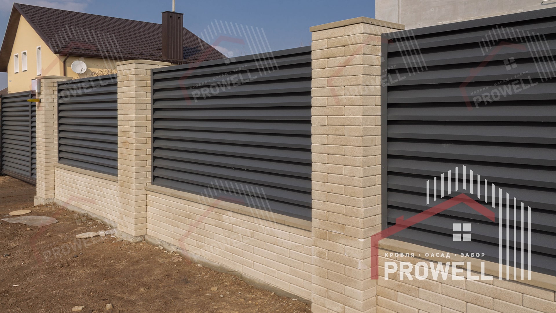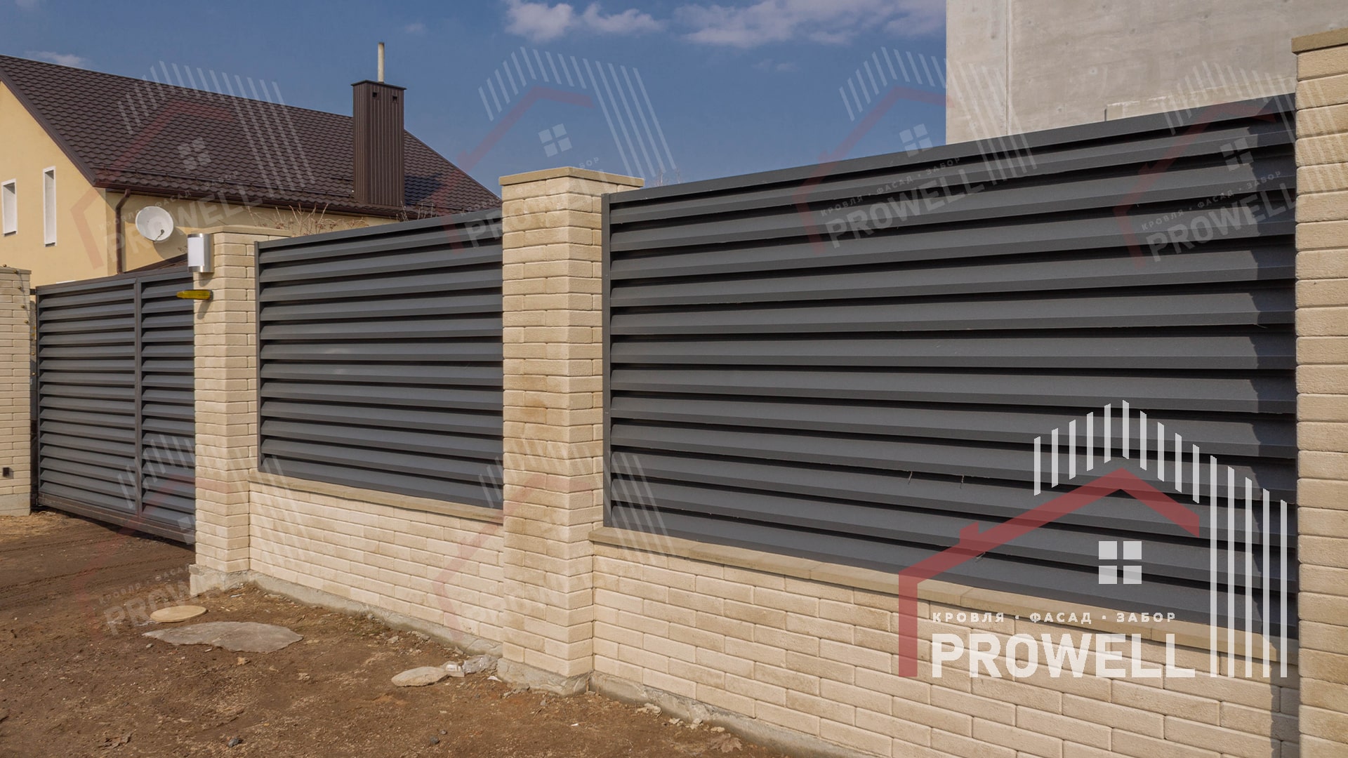 Забор из ЛЕГО КИРПИЧА, Жалюзи RAL 7024 (серый графит) МАТ + установка ворот откатных, распашных + калитка
