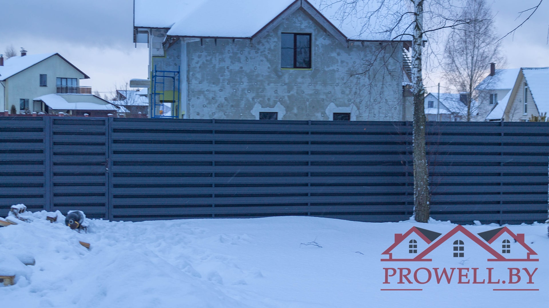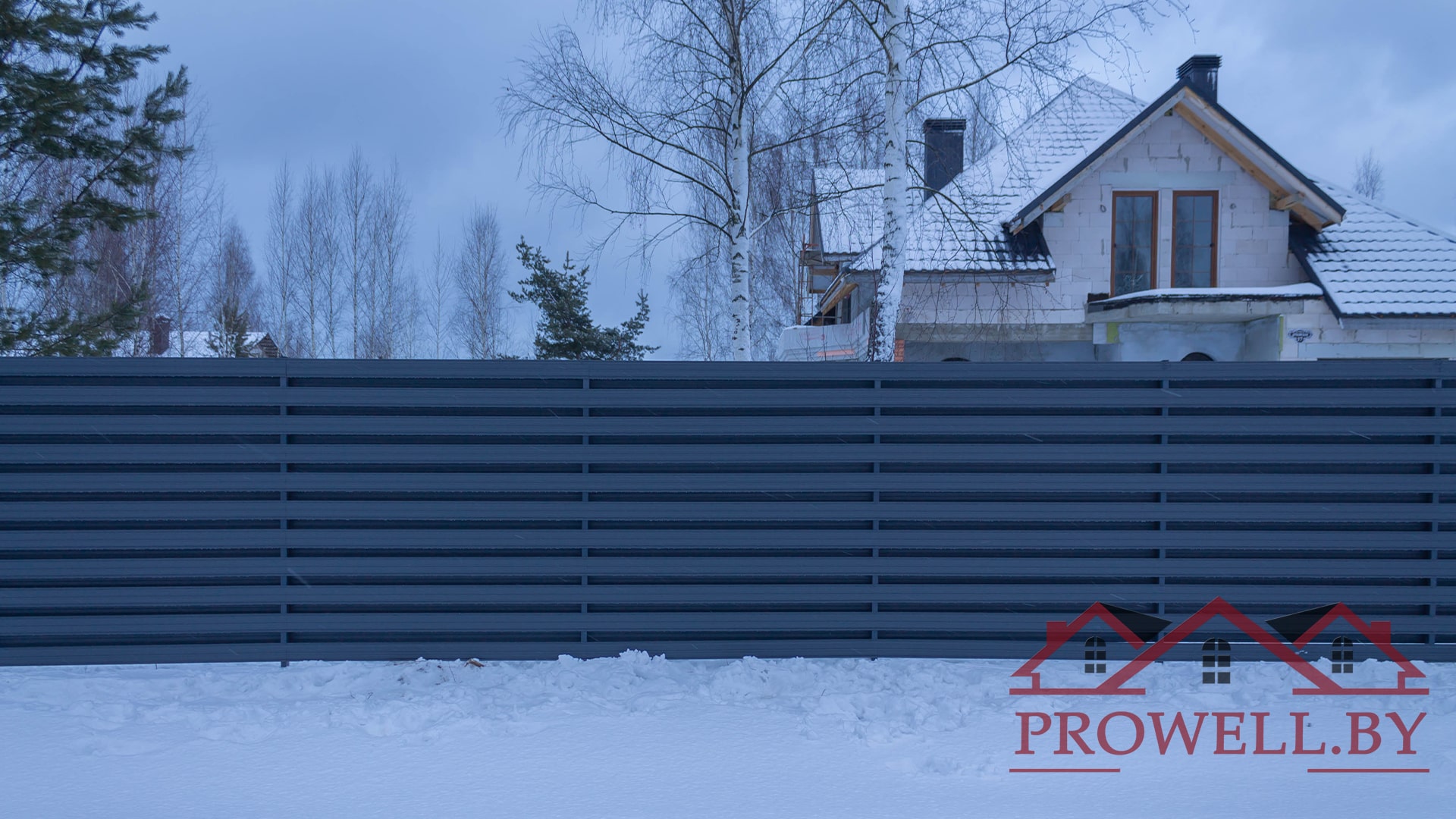 Забор РАНЧО из металлического штакетника "КЛАССИК 114 мм" RAl 7024 (серый графит) МАТ" + ворота откатные + калитка